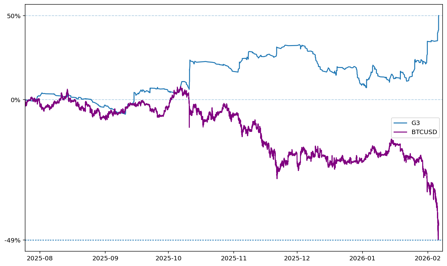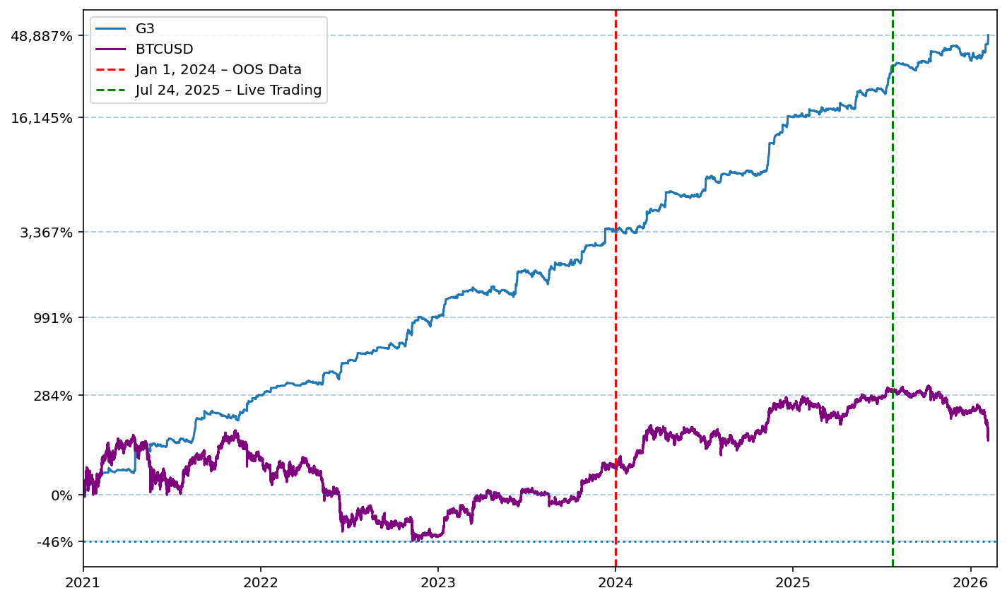Our current system is a portfolio of 20 uncorrelated trading algorithms - breakout, mean reversion and trend following - that trade the top 14 most liquid crypto assets on 4-hour and 1-hour timeframes.